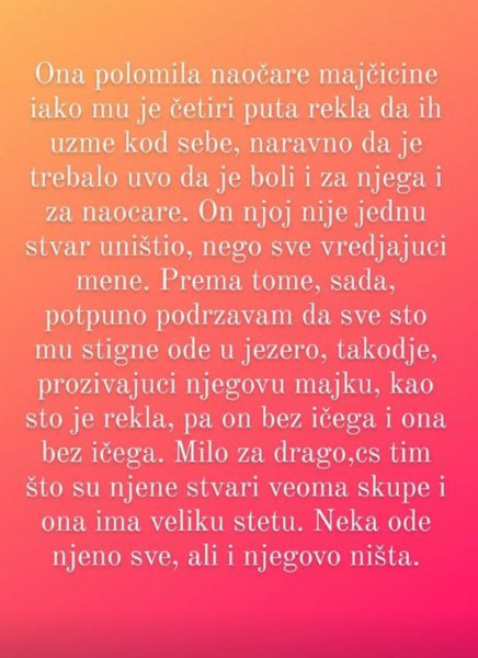 – Ona je polomila majčine naočare iako mu je četiri puta rekla da ih uzme kod sebe i naravno da je trebalo uvo da je boli i za njega i za naočare. On njoj nije jednu stvar uništio , nego sve vređajući mene. Prema tome, sada, potpuno podržavam da sve što mu stigne ode u jezero. Milo za drago – napisala je Marija na Instagramu.